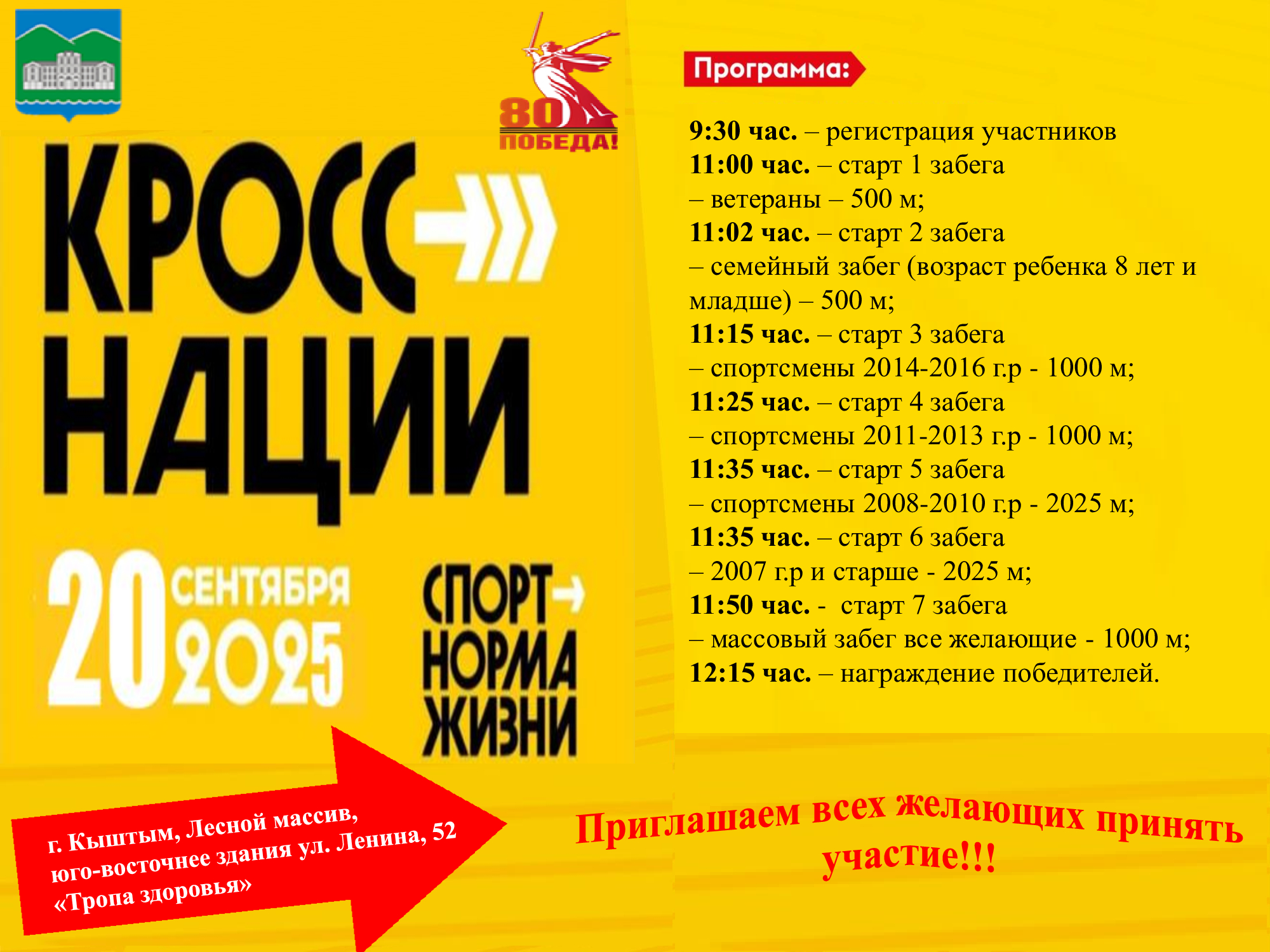 Управление по физической культуре и спорту администрации Кыштымского городского округа совместно с Центром тестирования Всероссийского физкультурно-спортивного комплекса ГТО г. Кыштыма приглашает 20 сентября 2025 г. на «КРОСС НАЦИИ — 2025», место проведения: г. Кыштым, Лесной массив, юго-восточнее здания ул. Ленина, 52 «Тропа здоровья».
