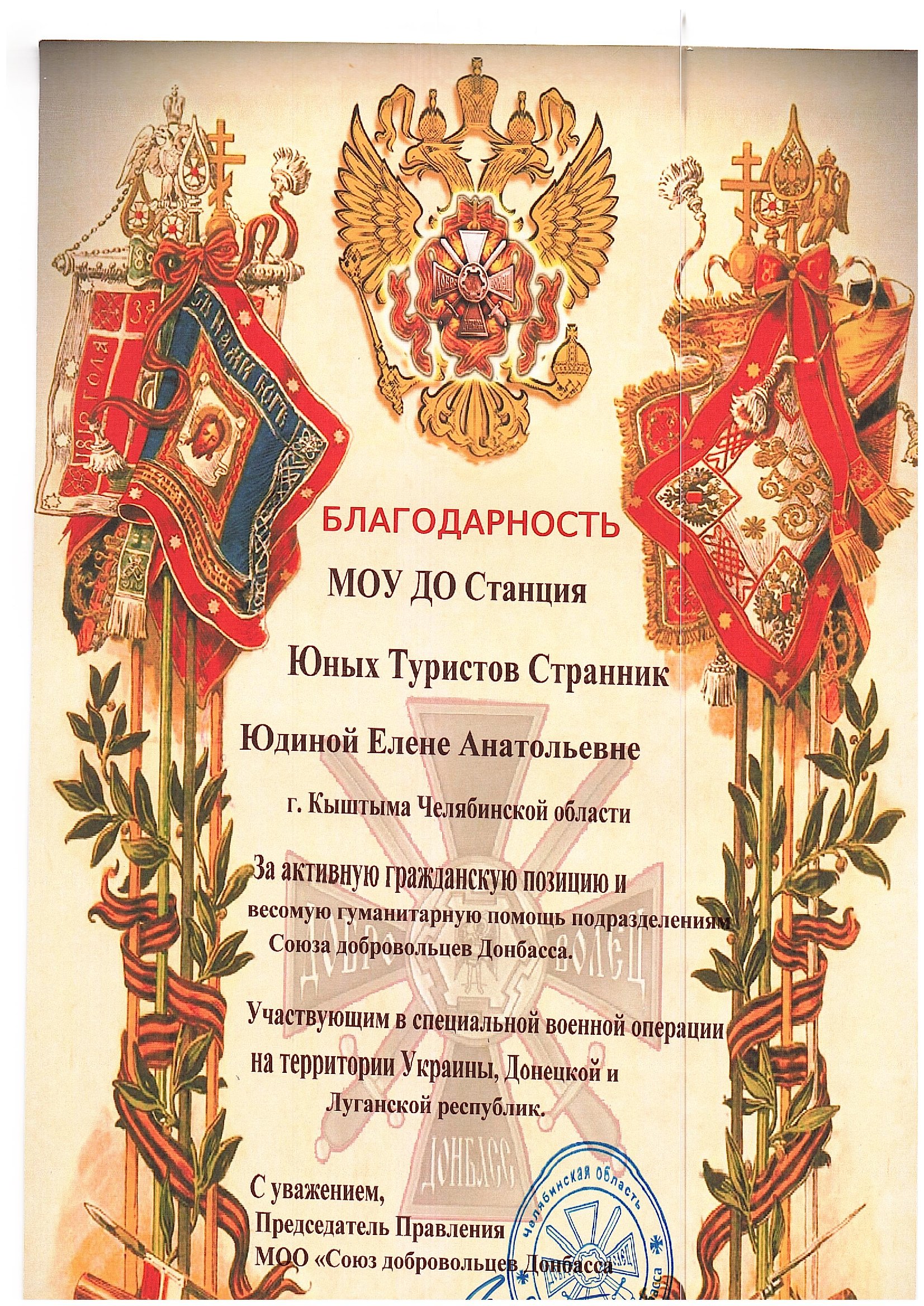 В июне 2025 года педагог МОУ «СОШ№9» Елена Анатольевна Юдина была награждена Благодарностью за активную гражданскую позицию и весомую гуманитарную помощь подразделениям Союза добровольцев Донбасса, участвующим в СВО на территории Украины, Донецкой и Луганской республик.