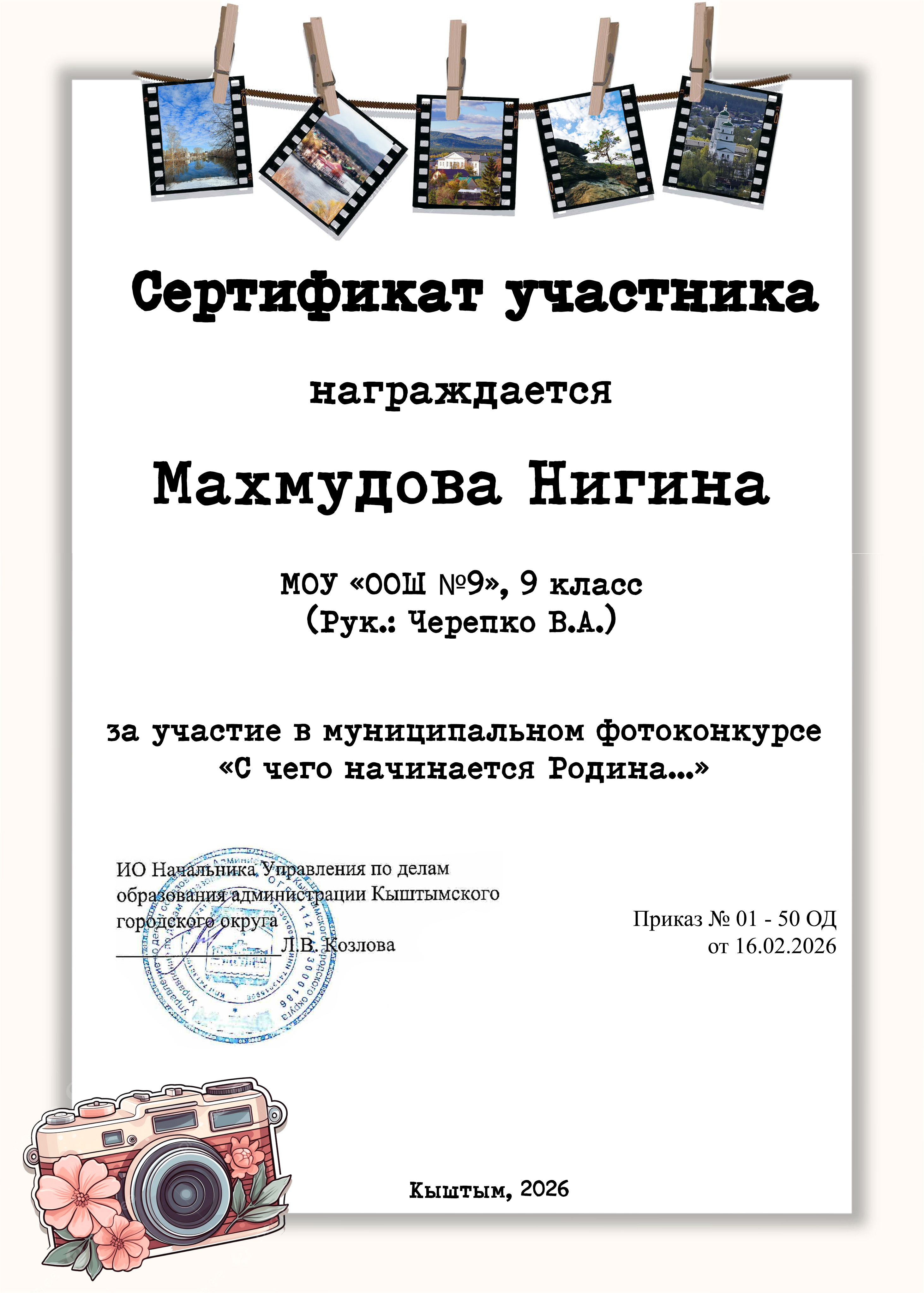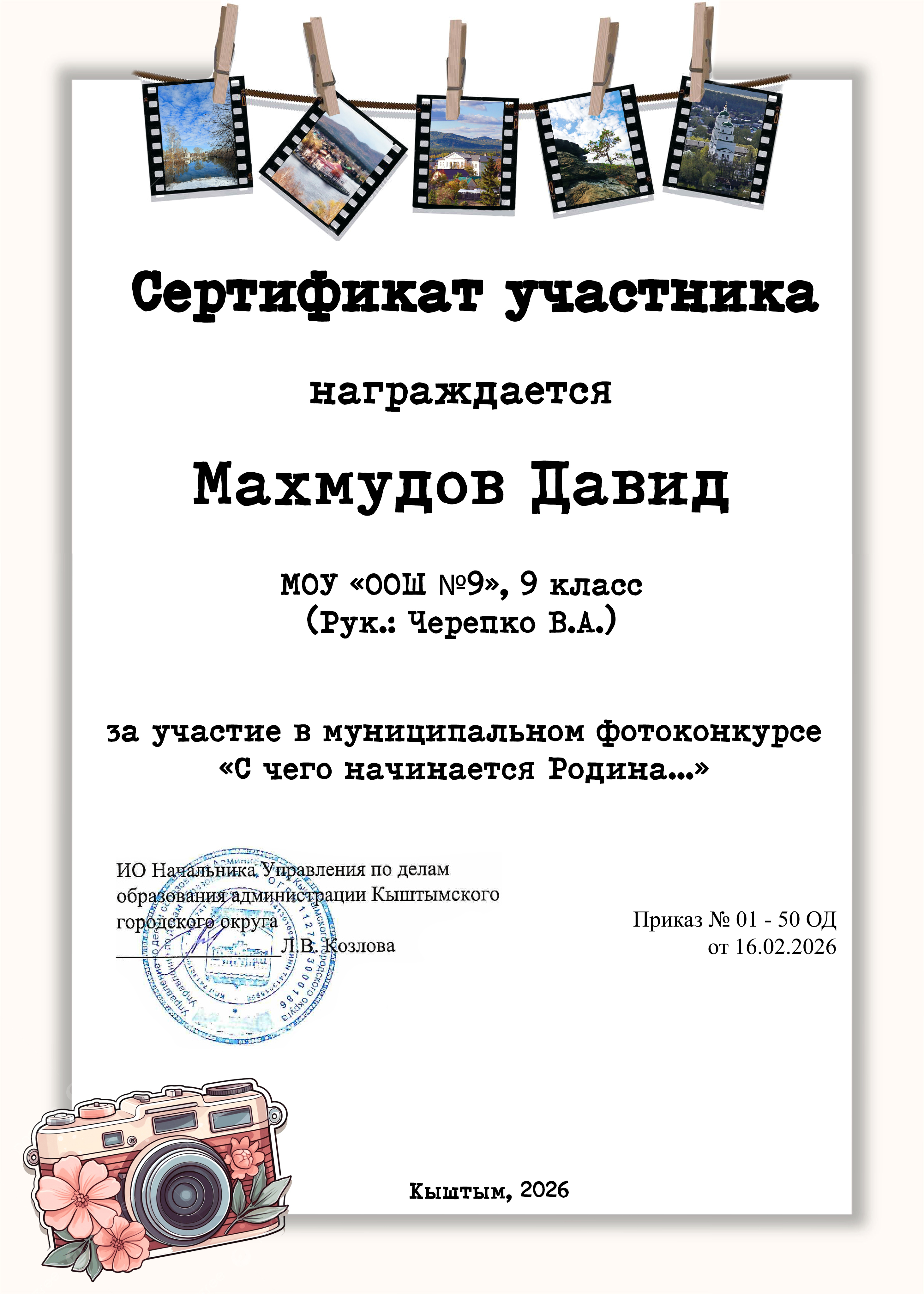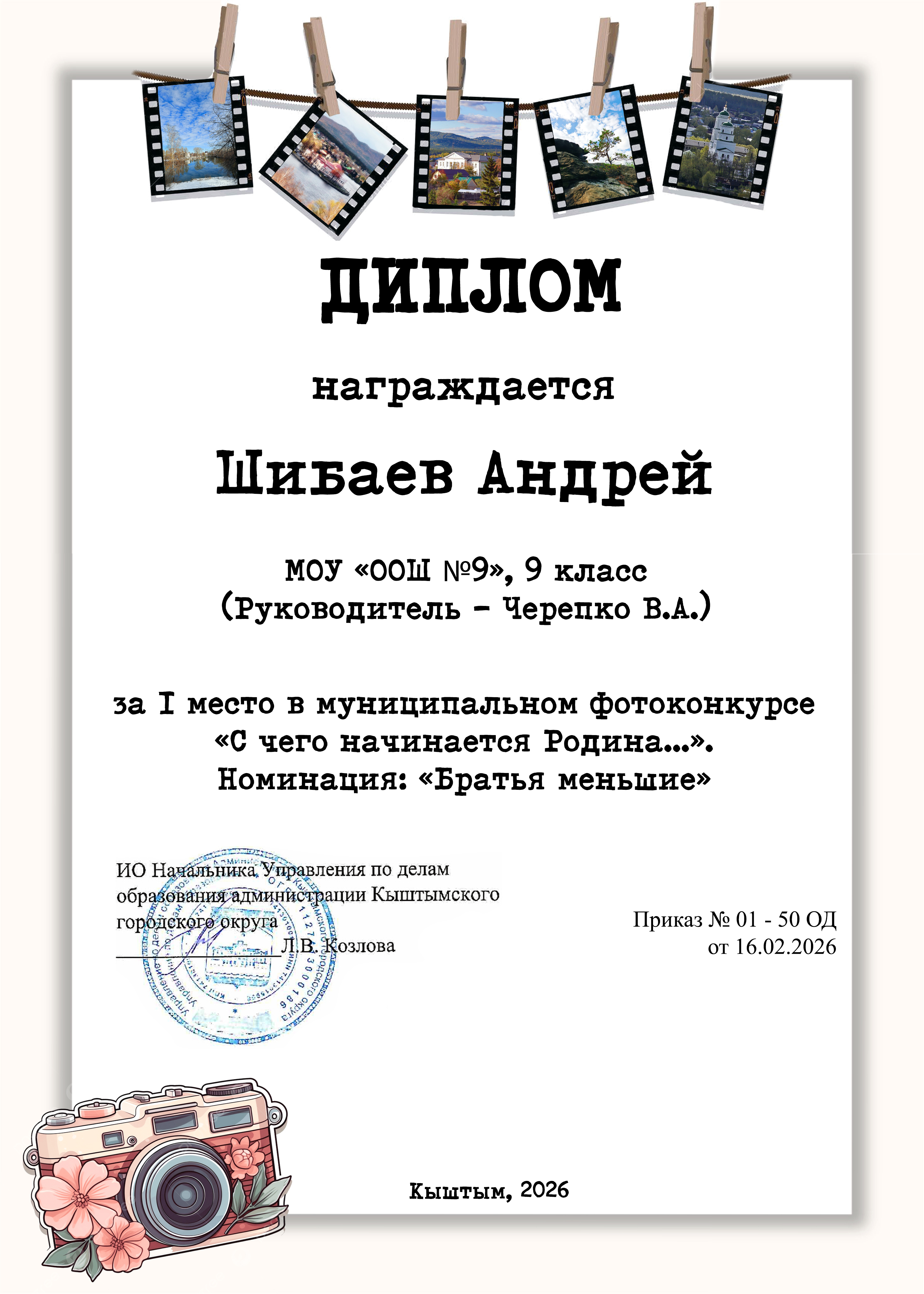 Учащиеся 9 класса нашей школы Андрей Шибаев, Давид Махмудов, Нигина Махмудова, под руководством В.А. Черепко приняли участие в муниципальном фотоконкурсе "С чего начинается Родина". А. Шибаев занял 1 место в номинации "Братья меньшие" и 2 место в номинации "Родная земля".