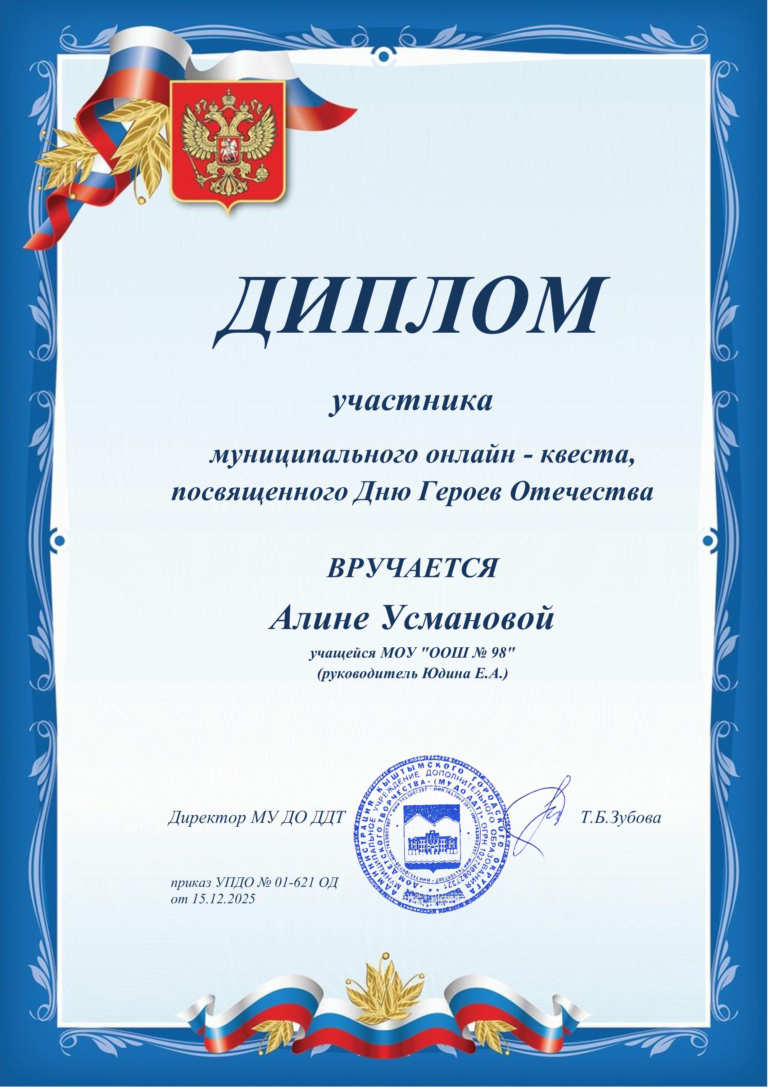 Ученица 7 класса Алина Усманова стала участницей муниципального онлайн-квеста, посвященного Дню Героев Отечества. Алина награждена Дипломом участника. Спасибо классному руководителю - Е.А.Юдиной. Молодцы!